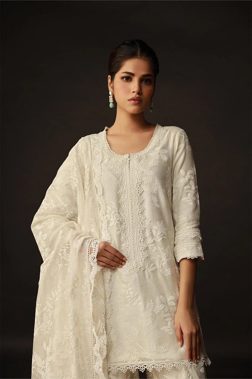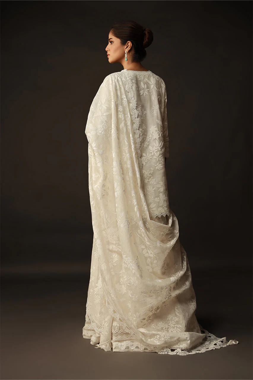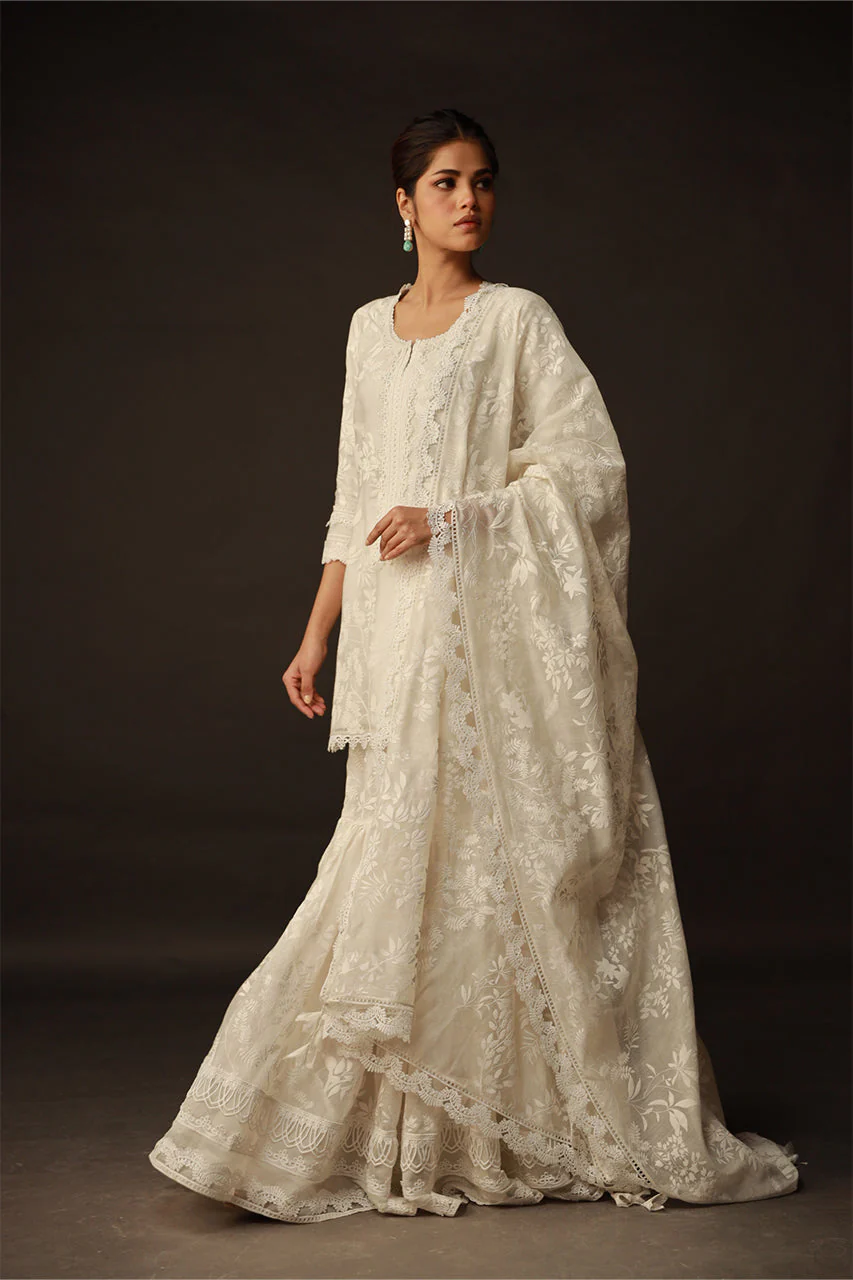 A vision of pure elegance, this outfit features plain cotton net embellished with an off-white leaf screen print jaal. The dupatta boasts scallop lace on all four sides, while the gharara border showcases three different enchanting laces. Tassels on the chaaks and intricate lace details on the sleeves and daaman of the shirt add a touch of sophistication to this graceful ensemble.