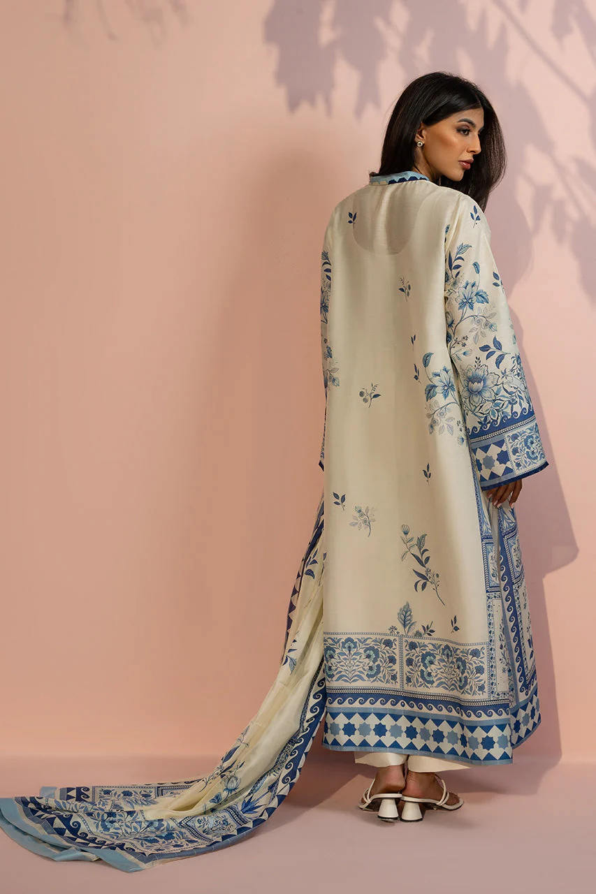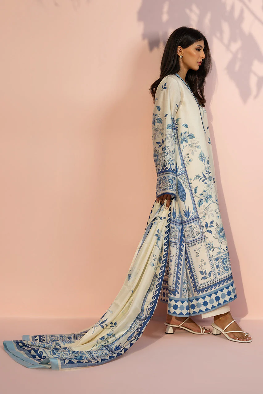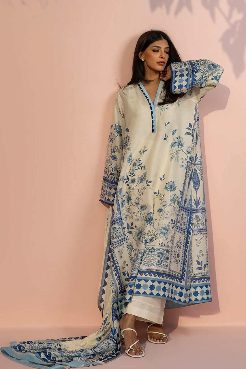 An elegant ivory toned ensemble featuring a relaxed A line khaddi silk kurta, adorned with intricate cobalt blue botanical embroidery and decorative floral motifs. The design is accented by a classic V neckline with a contrasting azure border and wide flared sleeves detailed with a mix of geometric and floral patterns. Paired with ivory hued pure rawsilk culottes finished with horizontal pleat detailing, the look is completed with a coordinating printed medium silk dupatta framed by a bold azure border for a breezy, sophisticated finish.