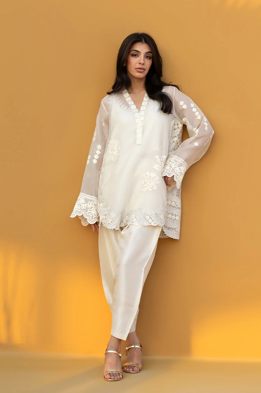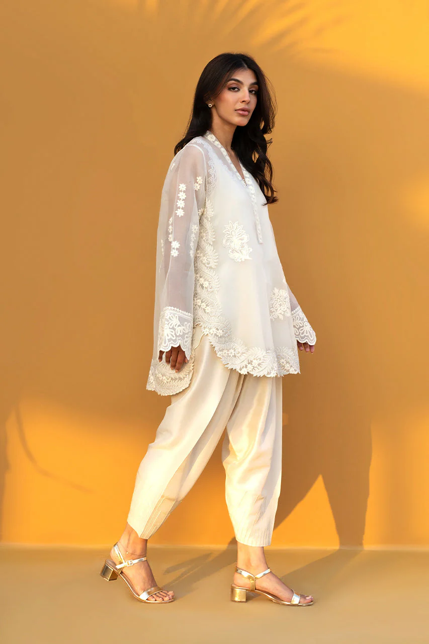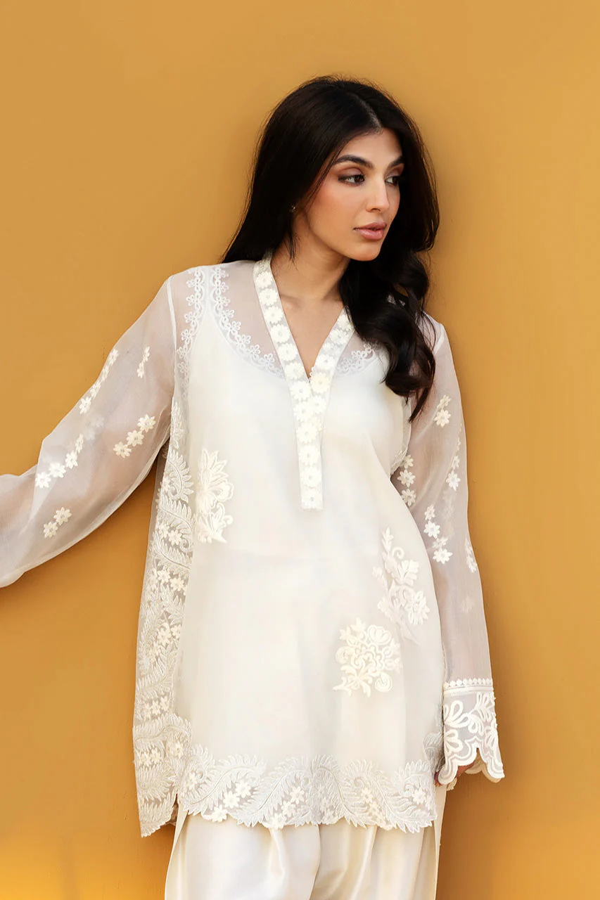 Radiating a luminous, ethereal charm, this ivory hued ensemble features an oversized sheer organza shirt, meticulously embellished with tonal floral aari work and scattered embroidery. The silhouette is defined by a bold V neckline framed with floral motifs, layered over a matching crepe camisole for a refined play on transparency. Statement sleeves and a scalloped hem lend textured depth, while lustrous pure rawsilk shalwar adds a fluid, modern drape, completing the monochromatic look with effortless grace.